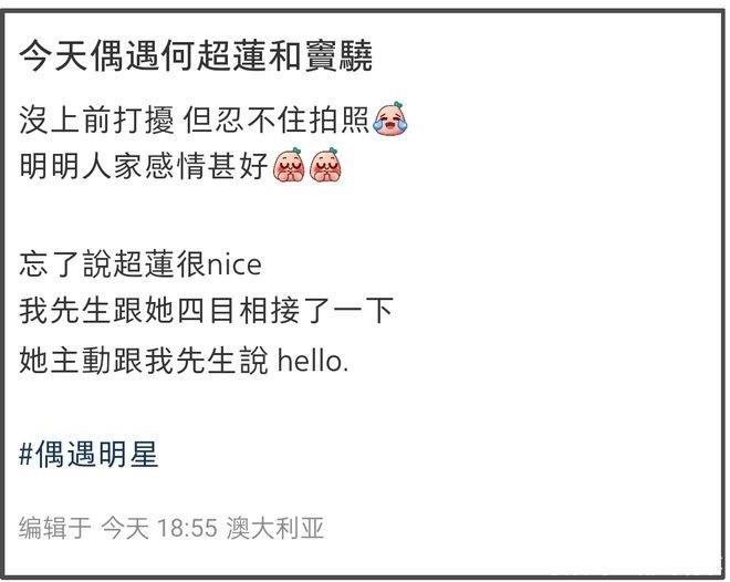 更有目击者补充,何超莲性格亲和,眼神交汇时主动微笑打招呼,待人真诚不做作。