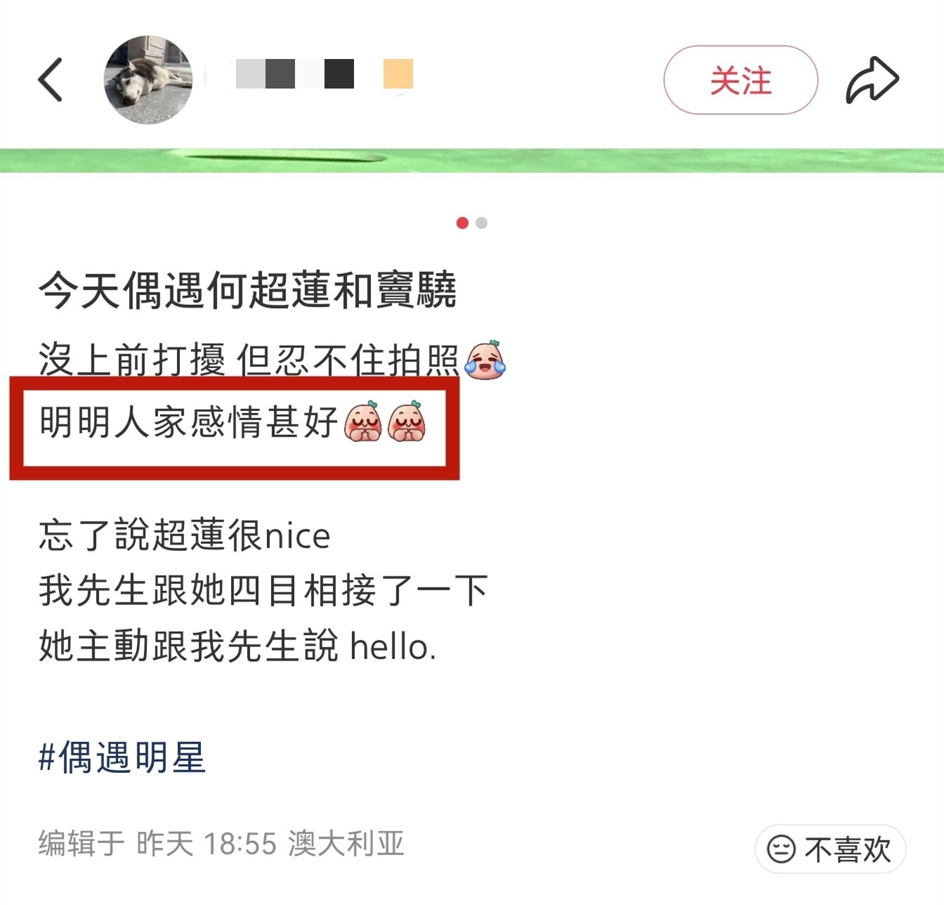 11月9日,有网友在澳大利亚悉尼意外邂逅了窦骁与何超莲夫妇。