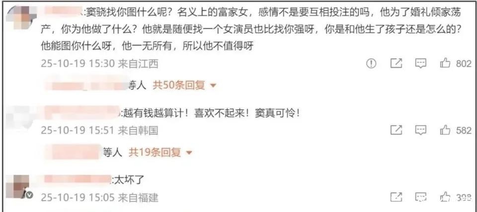 她说男方耗尽积蓄办婚礼至今难以回本,可窦骁近两年持续接戏,2025年已确认参演三部作品,虽非顶流资源,但收入稳定,并无经济窘迫迹象。